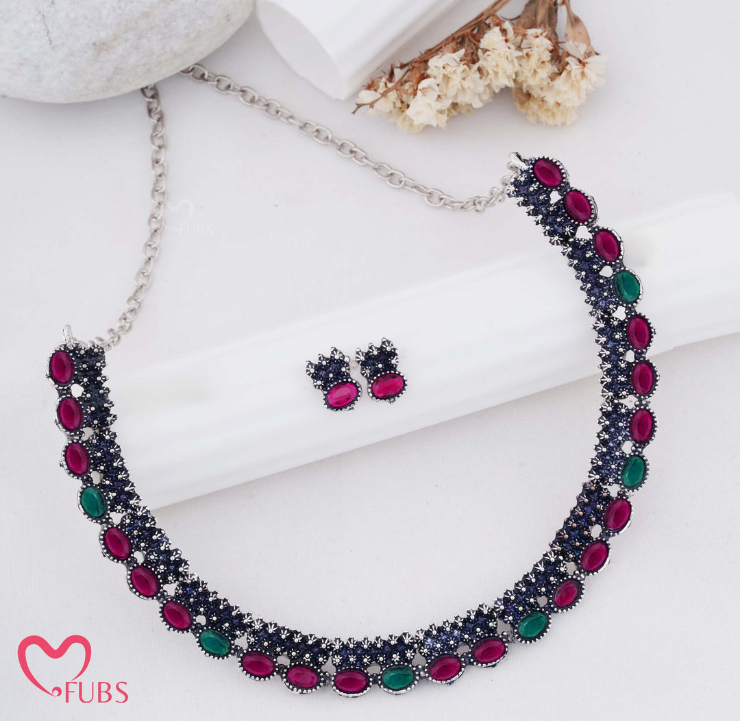 Oxidized-Tone Geometric Necklace Set with Diamond & Square Stones