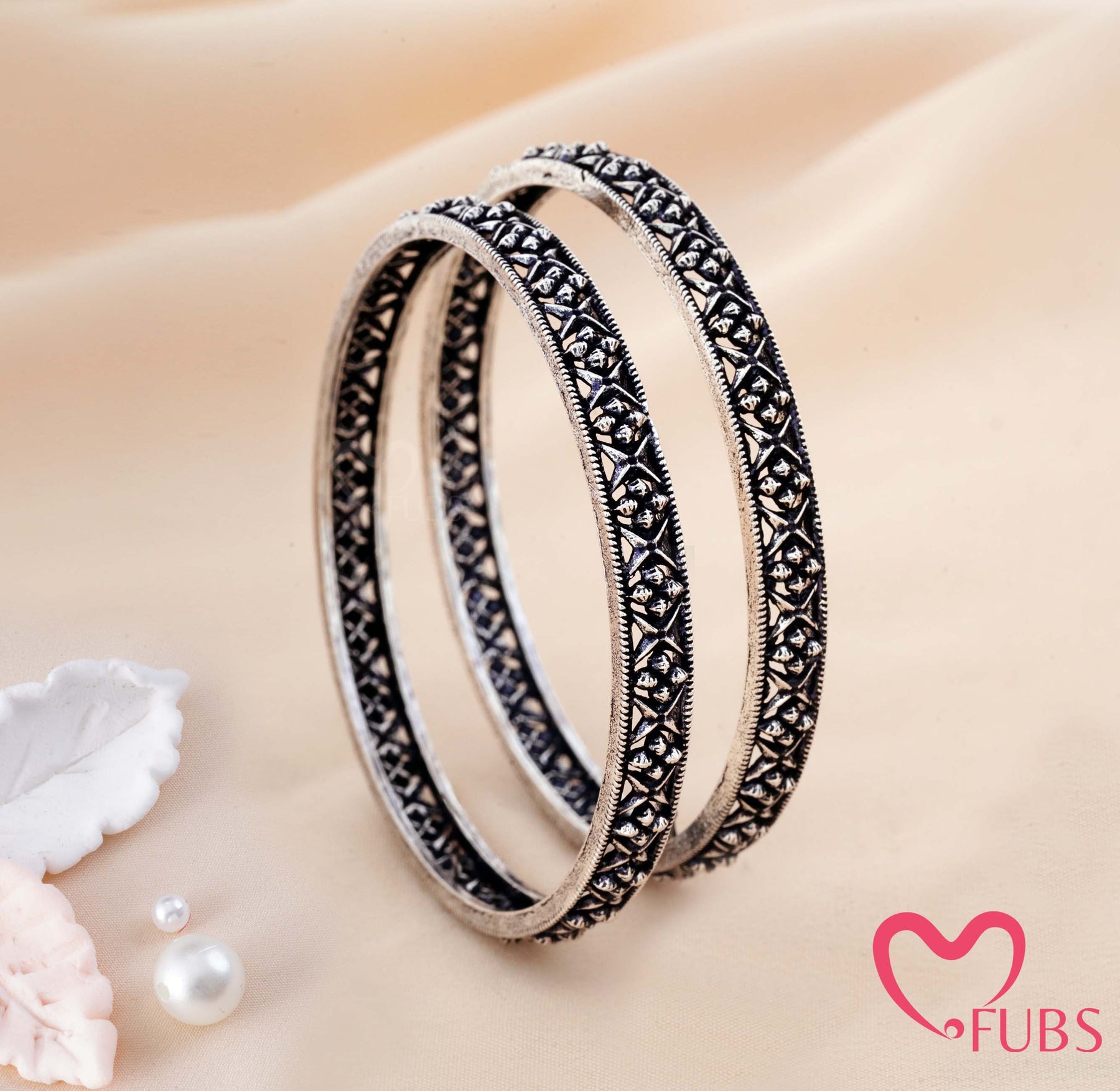 Celebrate timeless tradition with FUBS Oxidized Bangles, crafted to add a touch of elegance to every occasion. Designed with intricate floral detailing and finished in a classic oxidized silver tone, these bangles embody grace, beauty, and heritage.