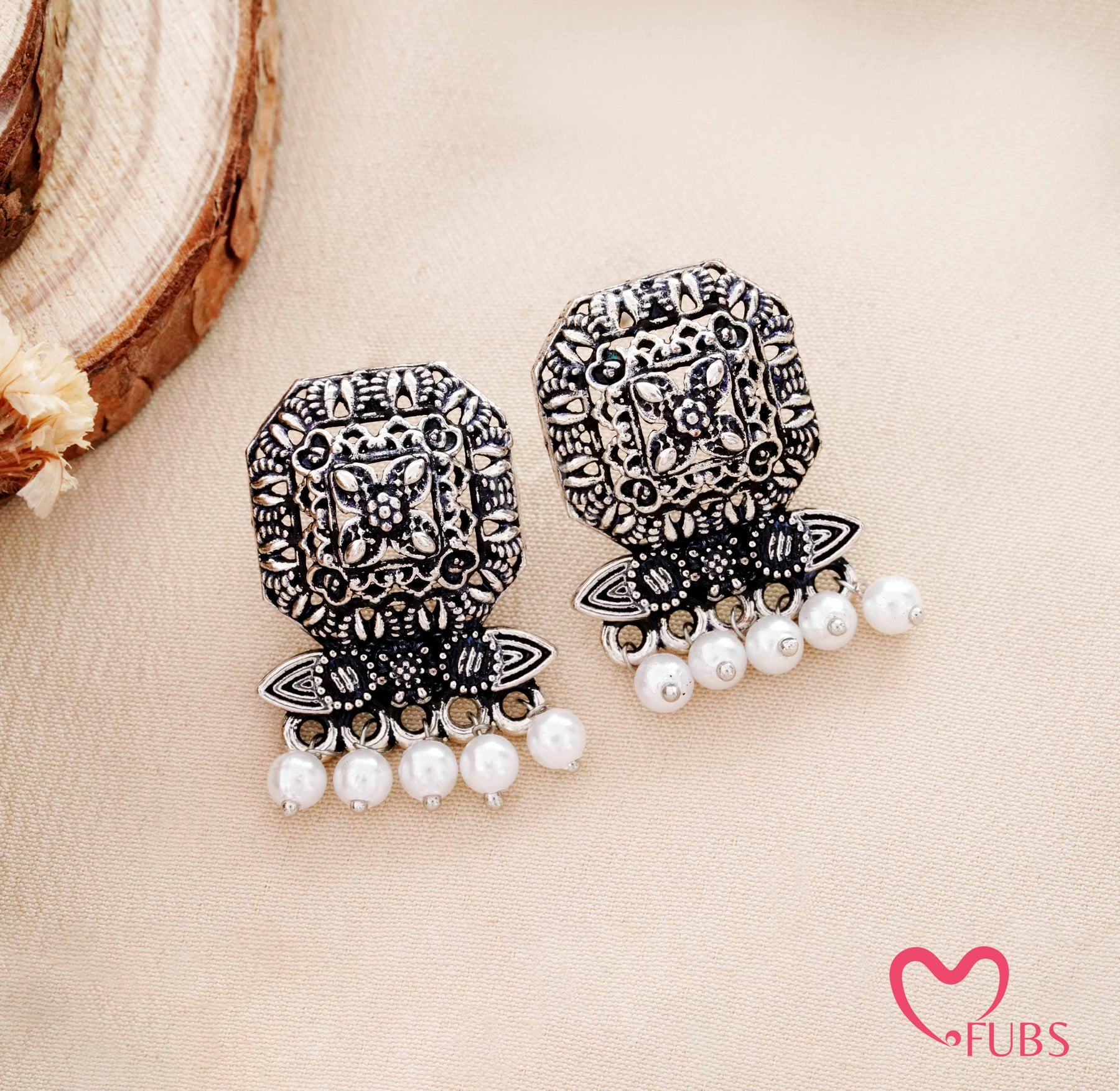 Aesthetic Oxidized Silver Stud Earrings with Pearl Drops