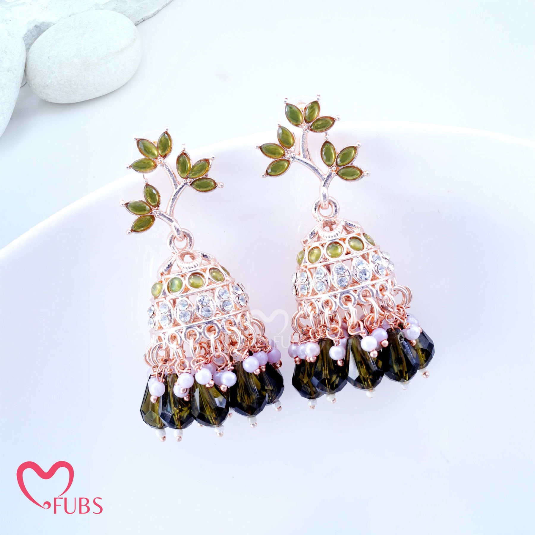 Botanical Motif Jhumkas with Faceted Stone Drops and Pearls