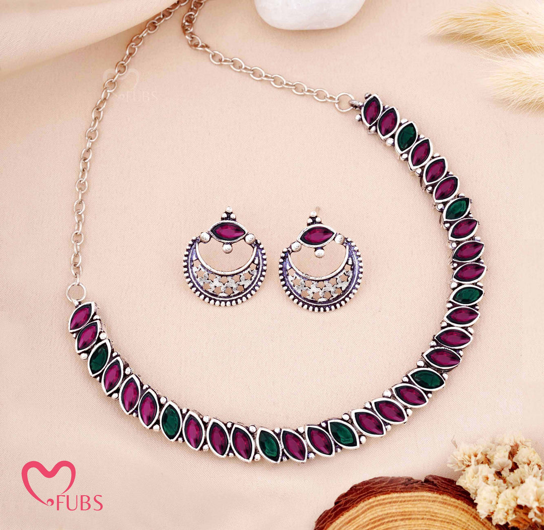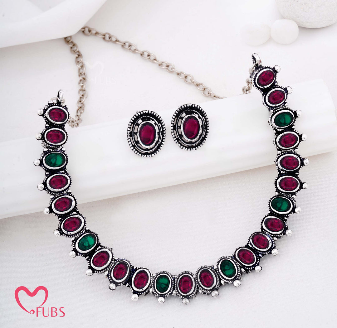 Oxidized Dual-Stone Choker Necklace Set with Floral Earrings