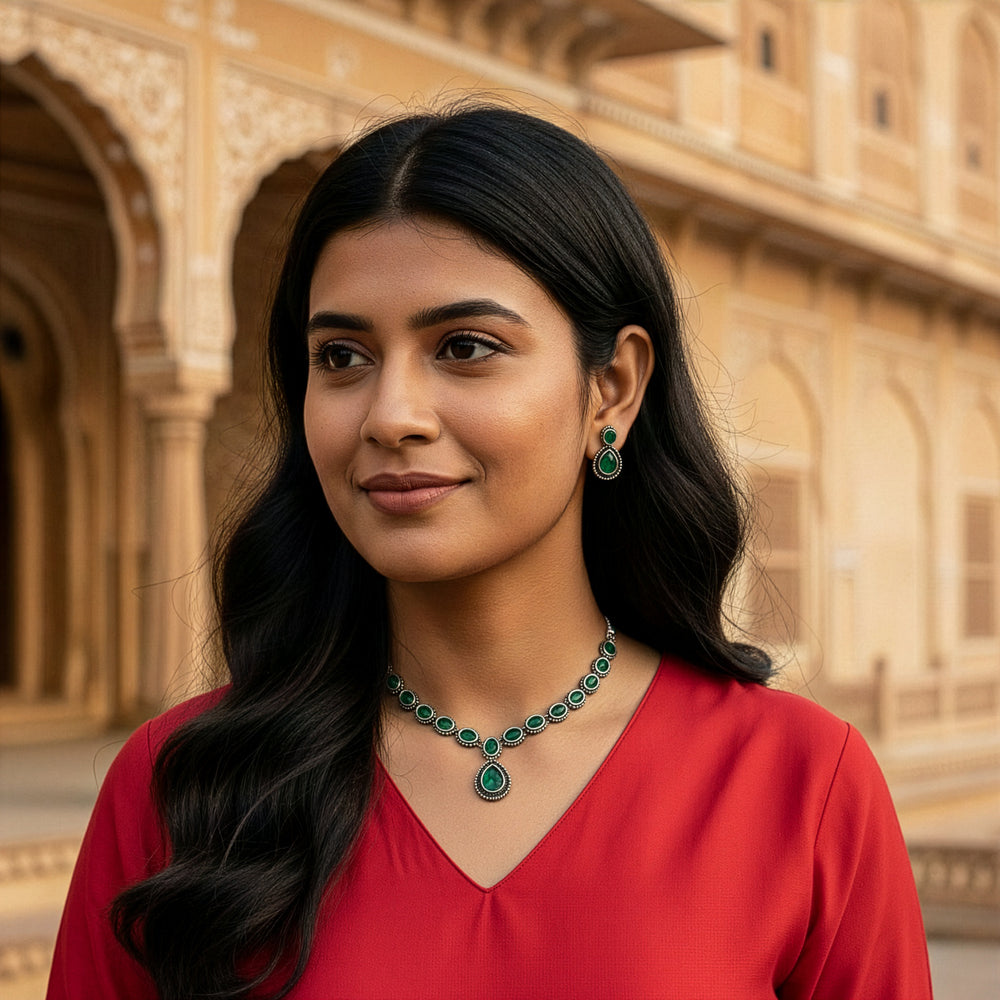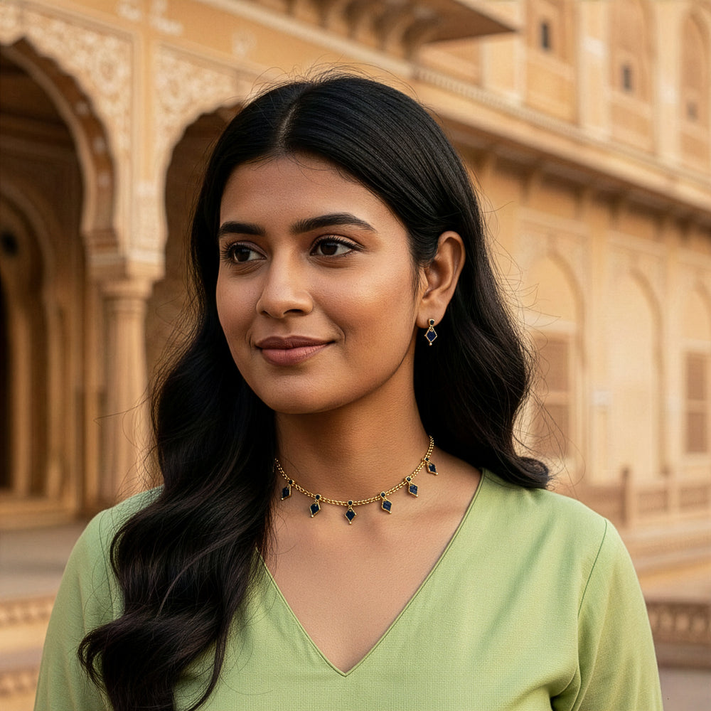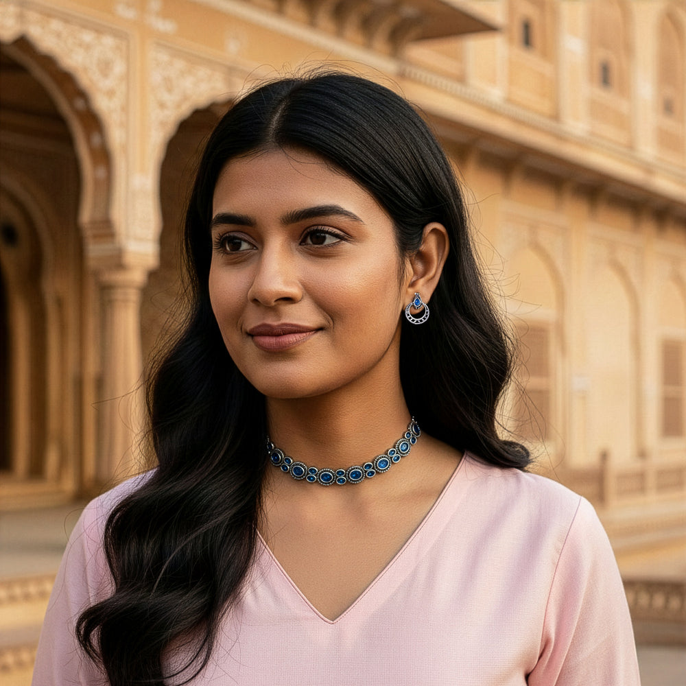 Traditional Single-Hued Oxidized Choker Set - Deep Aquatic Stone
