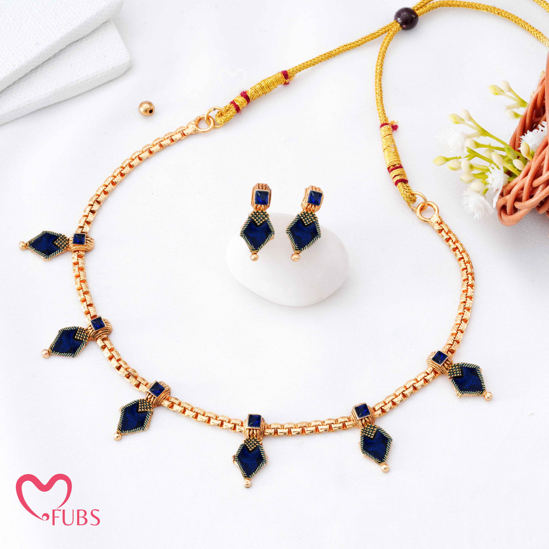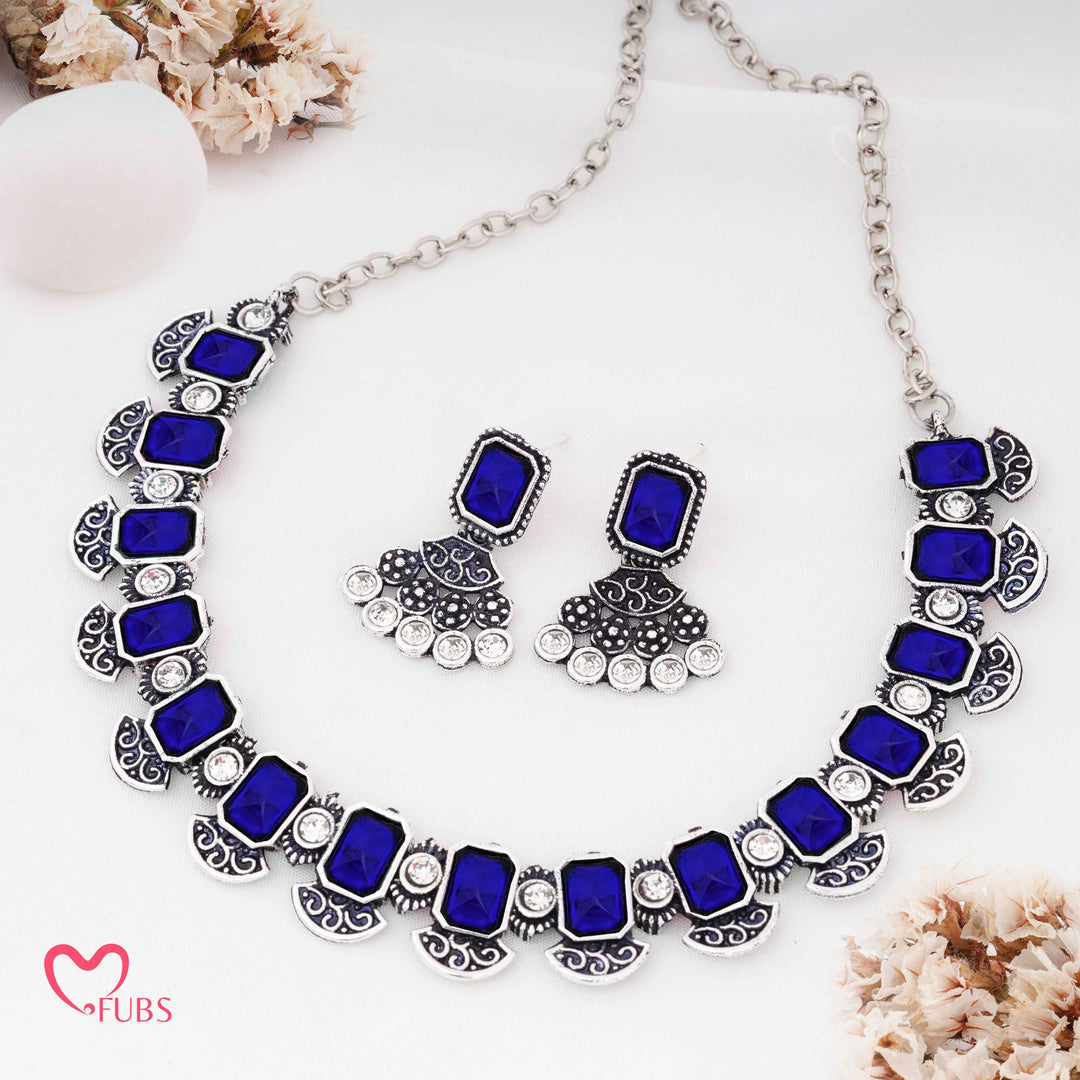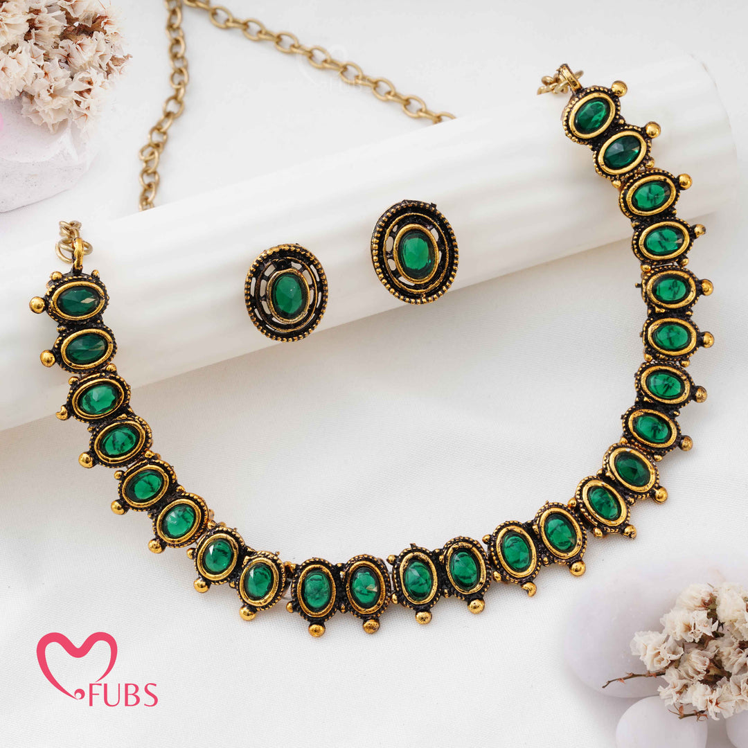 Traditional Single-Hued Oxidized Choker Set - Deep Aquatic Stone