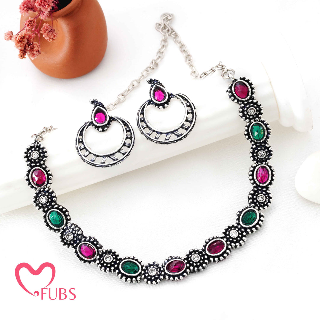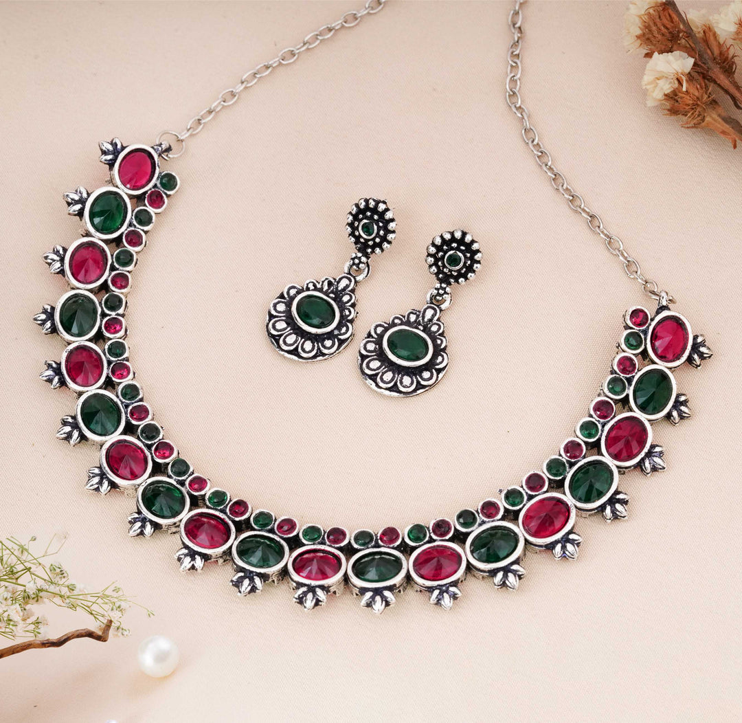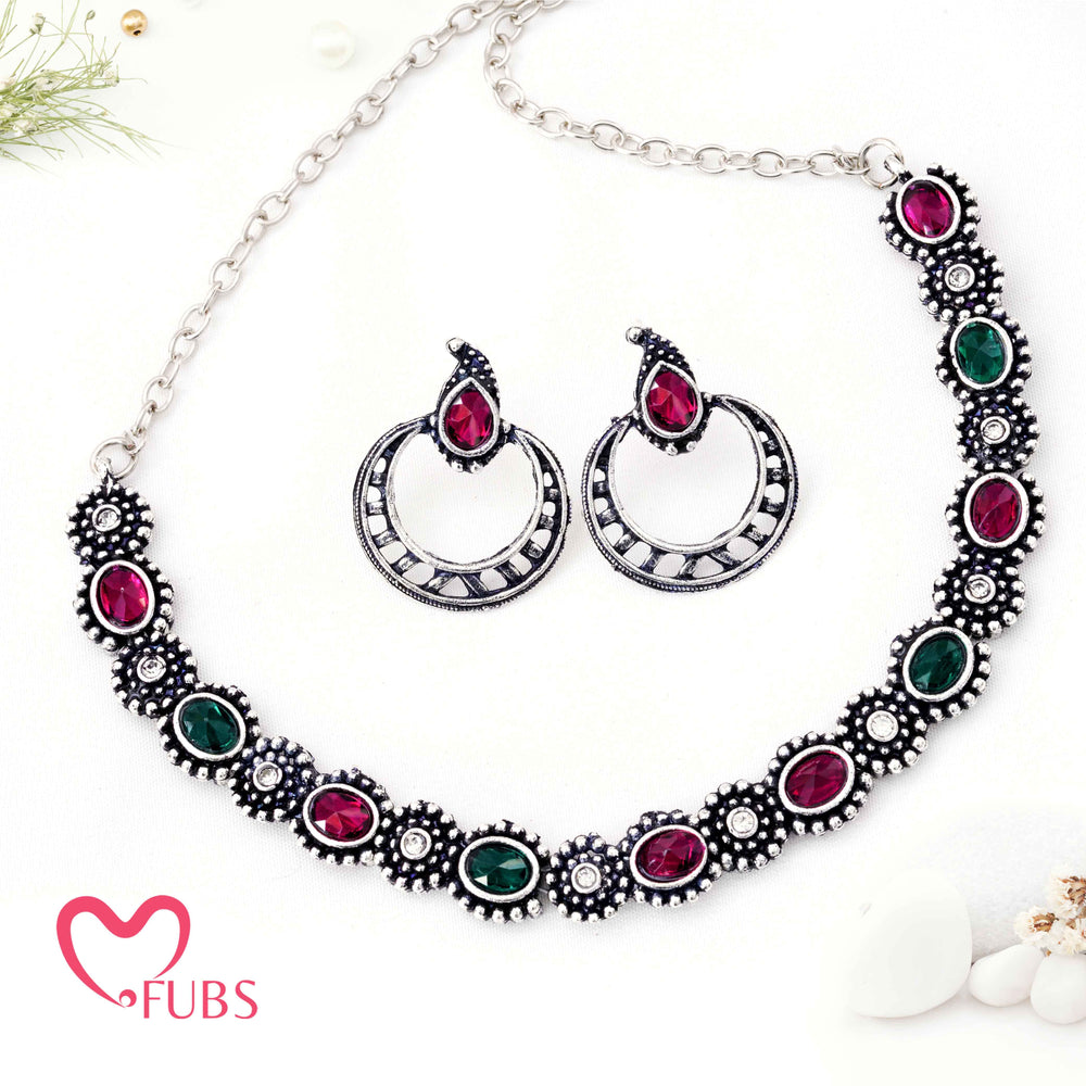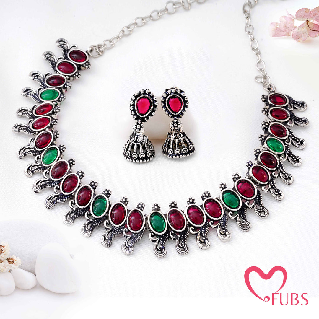 Maroon & Green Oxidized Choker Set - Antique Silver Finish