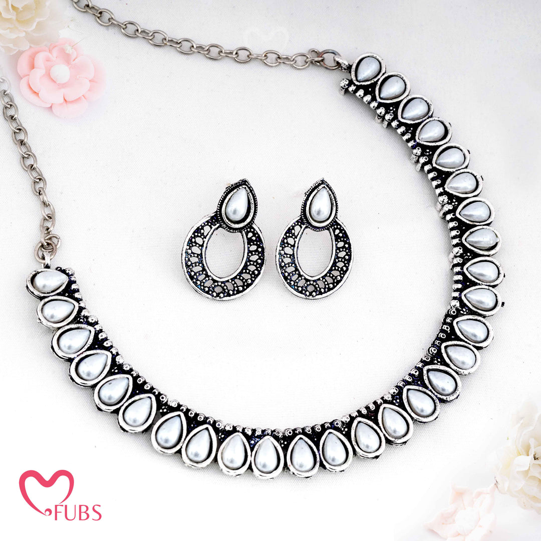 Oxidized Tear-Drop Stone Necklace Set - Lustrous Ivory