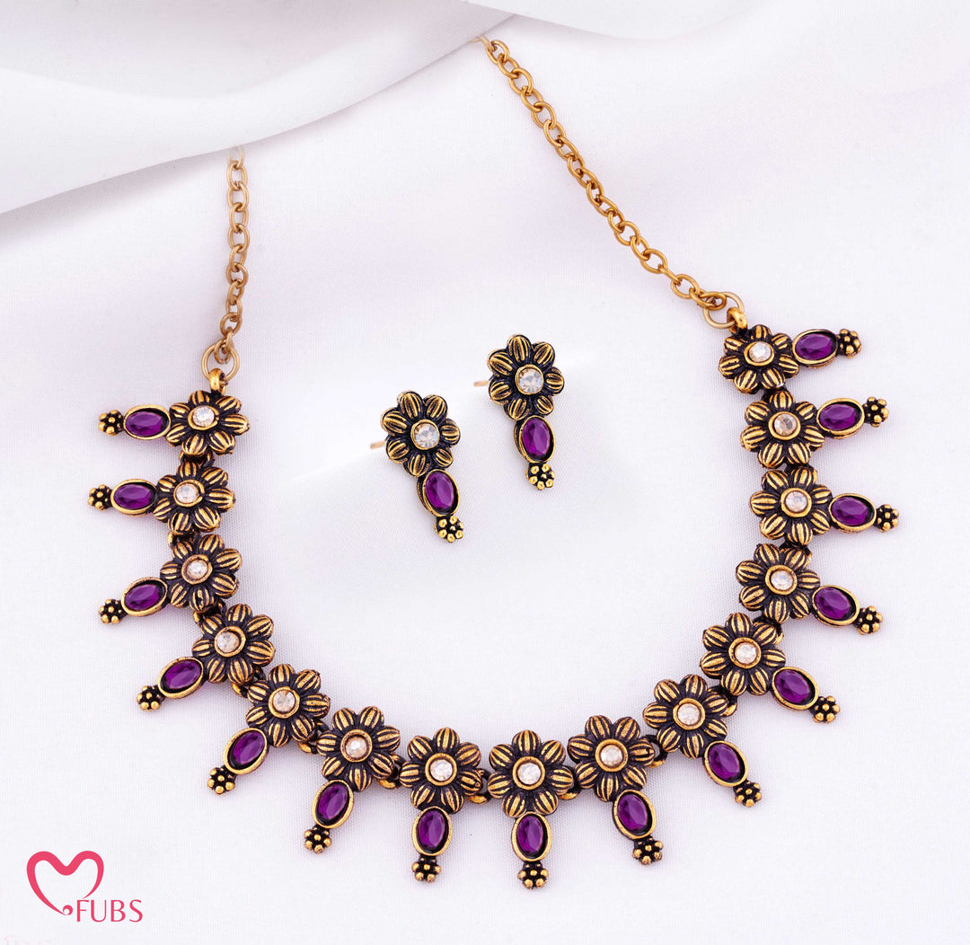Floral Pattern Oxidized Choker Set with Earrings