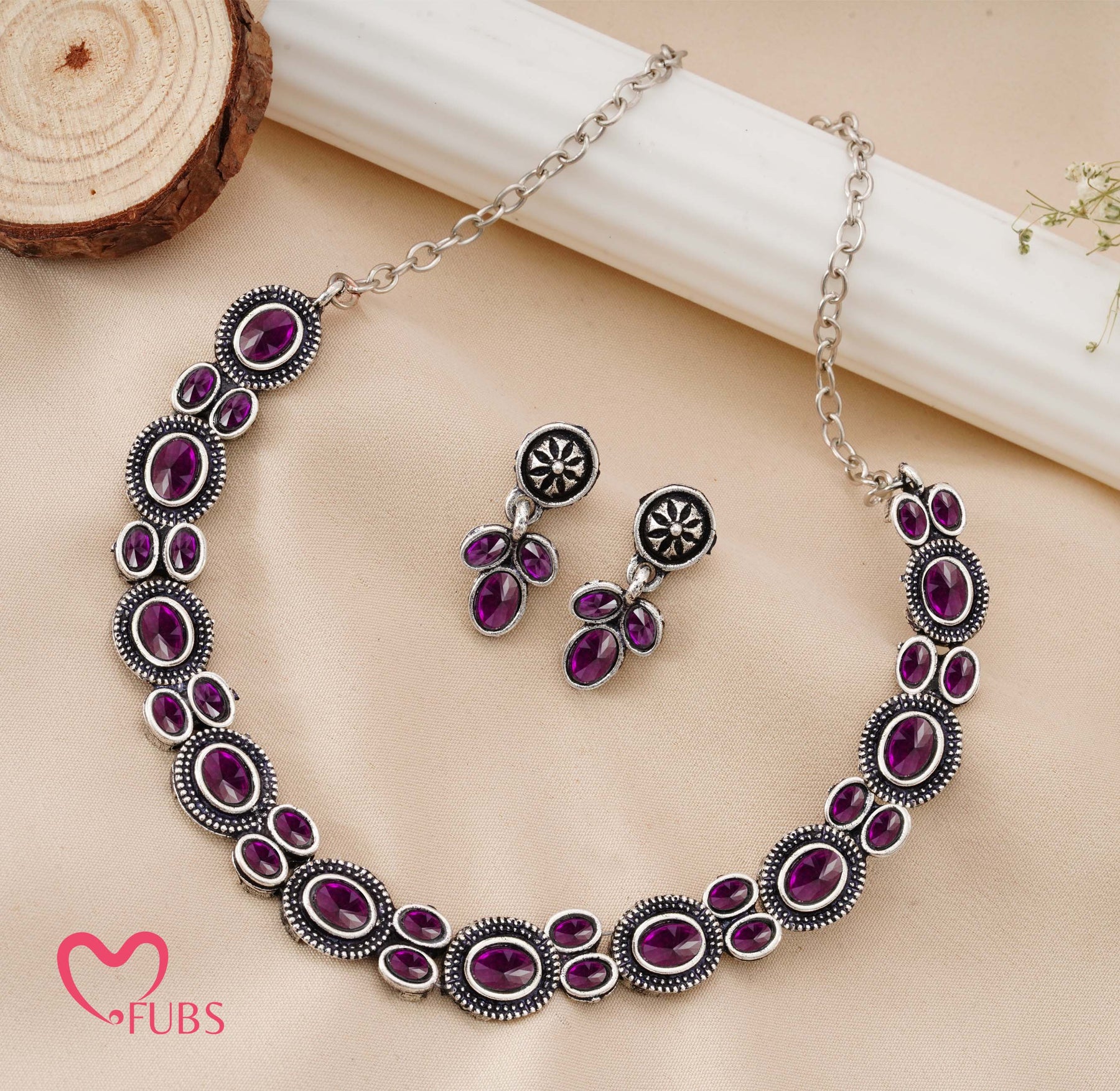 Traditional Oxidized Silver-Tone Necklace Set with Oval Stones