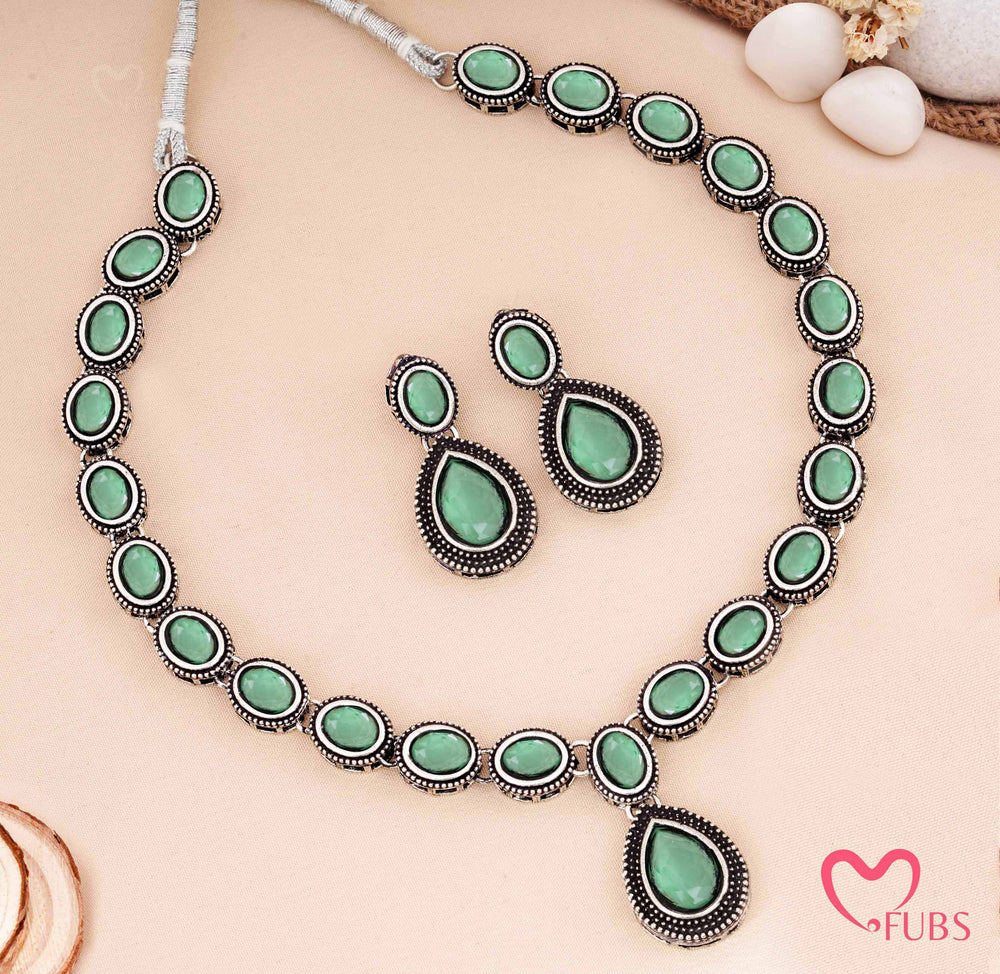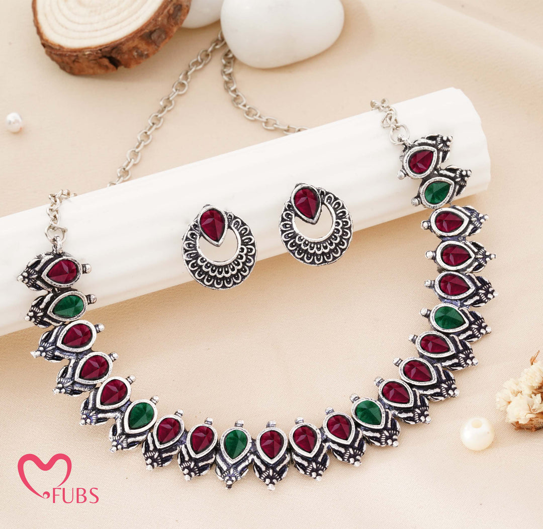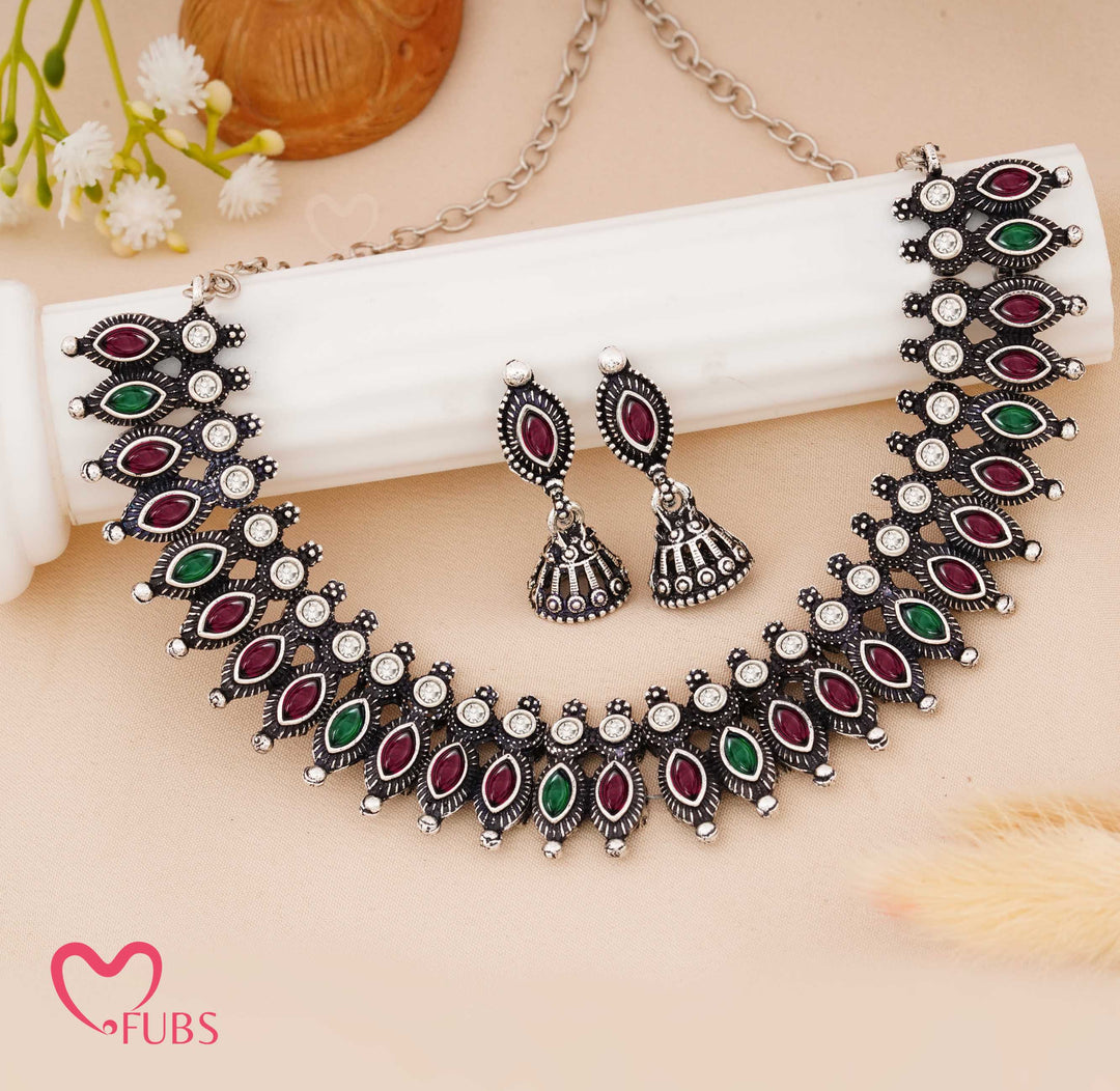 Oxidized Choker Necklace Set with Marquise Stone Motifs