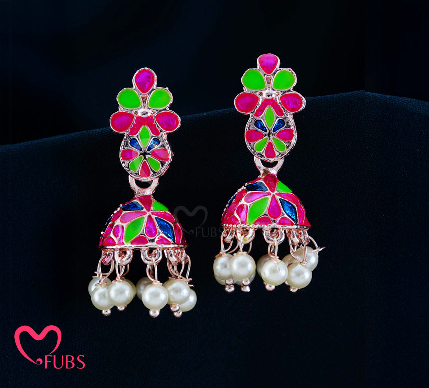 Colorful Jhumka Earrings with Floral Enamel & Pearls