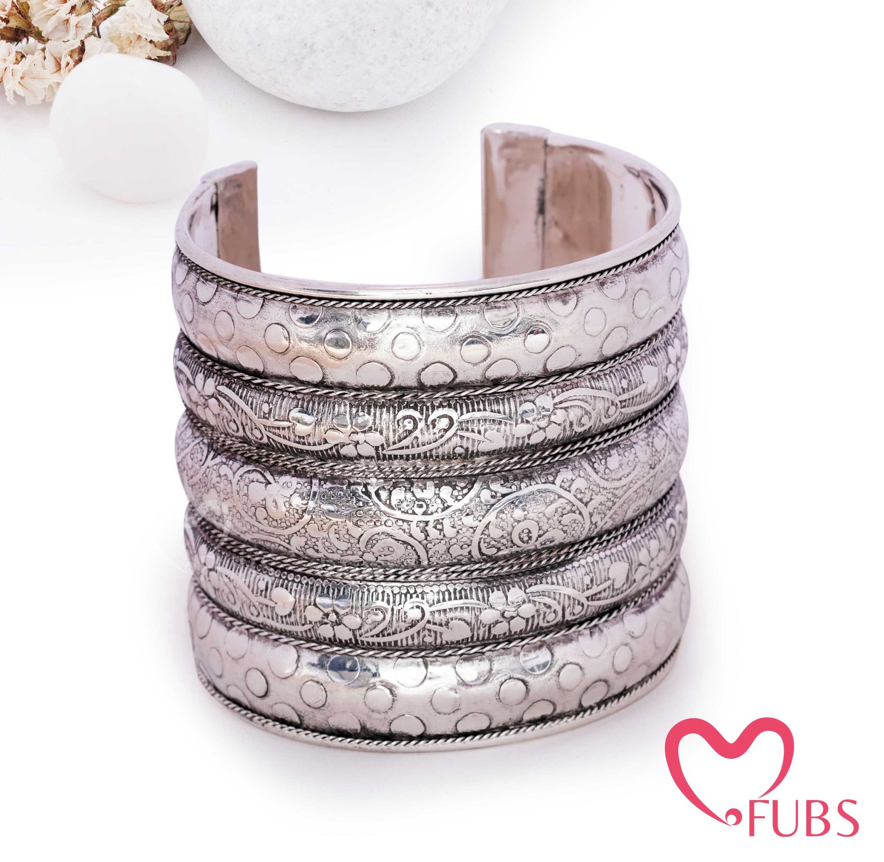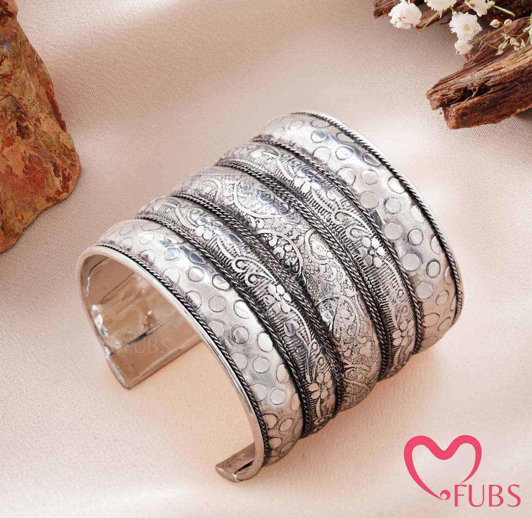 Five-Band Cuff Bracelet with Floral & Geometric Engravings