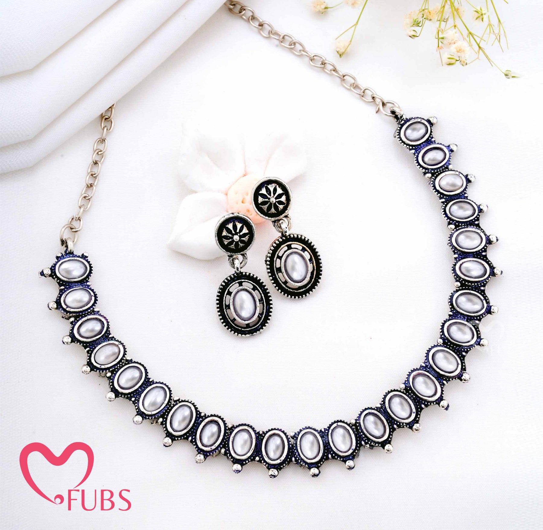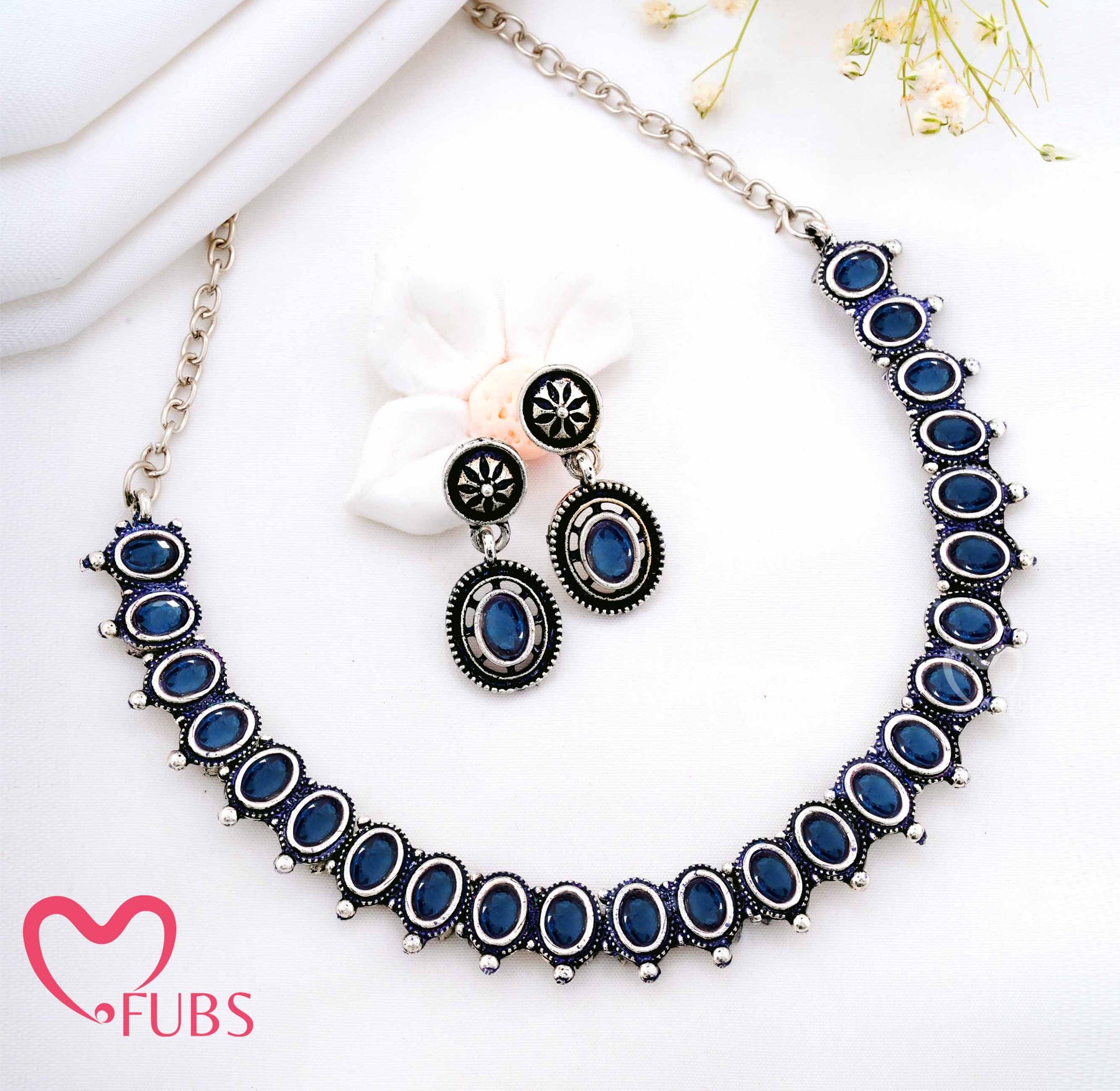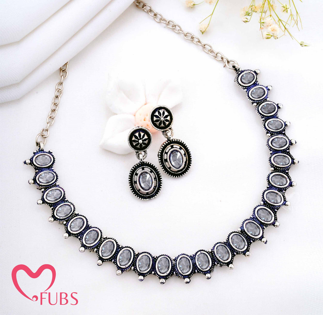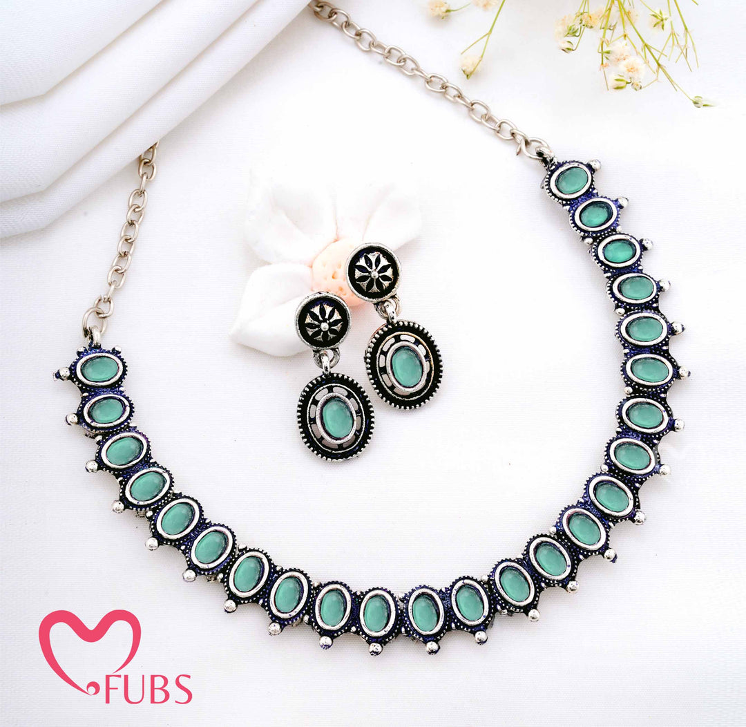 Oxidized Oval Stone Choker Set with Statement Earrings