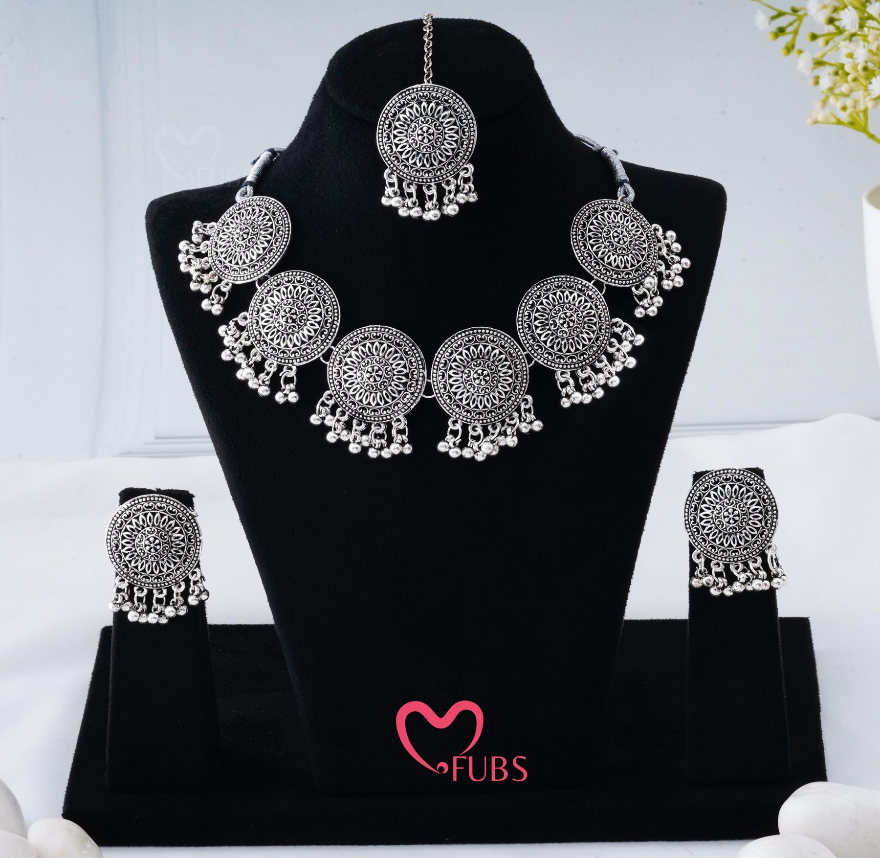 Sia Circular Filigree Oxidised Finish Necklace Set with Maang Tikka